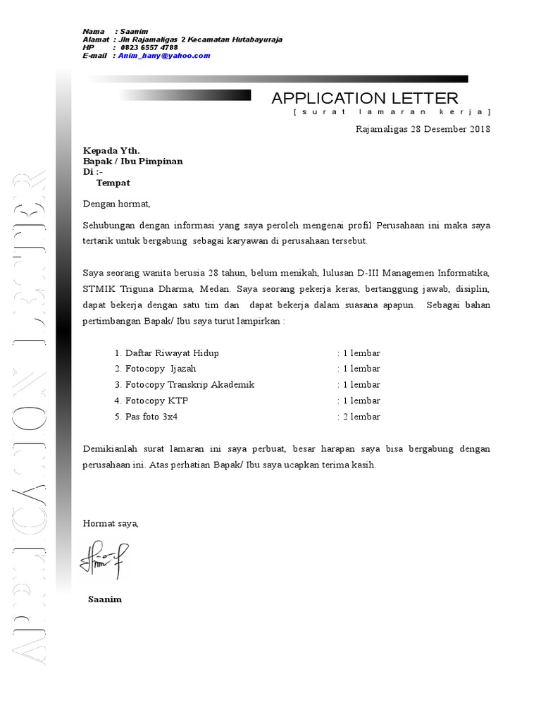 Contoh surat lamaran kerja yang baik dan benar untuk dijadikan referensi dalam usaha mencari kerja di sebuah perusahaan sesuai dengan keahlian kamu. Contoh surat lamaran kerja di atas merupakan gambaran untuk melamar kerja melalui email dalam bahasa inggris. Awali surat lamaran kerja kamu dengan informasi di mana kamu menemukan iklan lowongan pekerjaan tersebut. Selain mempertimbangkan nilai di ijazah ternyata penulisan surat lamaran kerja yang bagus dengan penggunaan eyd tepat dan sesuai. Panduan cara membuat surat lamaran seperti lamaran umum, fresh graduate, via email, tulis tangan, sebagai guru, cpns, di hotel, di bank, di toko, rumah sakit, berdasarkan iklan, bahasa inggris, +doc. Atau kamu sedang kuliah namun ingin magang di sebuah perusahaan? Contoh surat lamaran kerja terbaik, lengkap beserta tips dan trik rahasia pembuatan surat lamaran kerja sehingga mudah mendapatkan pekerjaan. Oleh karena itu pada artikel kali ini saya akan membahas tentang contoh surat lamaran kerja di pabrik lengkap dengan penjelasannya. Contoh surat lamaran kerja di bank bri. Contoh surat lamaran kerja di jne sebagai kurir. Posisi yang biasanya ditawarkan oleh pihak hotel meliputi office boy, resepsionis, chief engineer, personal. Seperti kita ketahui bahwa di hotel ada berbagai macam posisi pekerjaan yang bisa disediakan, seperti bagian kitchen, waiter, receptionist, housekeeping, room boy, front office, f&b service, dan posisi lainnya. Sangat mudah juga jika kamu lebih memilih untuk mengirimkan surat lamaran kerja melalui email.
