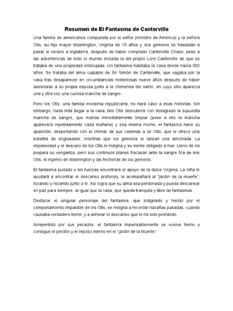 Vagaba por la casa tras desaparecer. A lo largo del libro, los lectores tienen la posibilidad de conocer la flamante realidad de los otis, un sofisticado clan norteamericano que ni la revelación del viejo dueño del lugar, quien les confiesa que allí vive desde tiempos inmemoriales el fantasma de lord simon canterville (asesino de su esposa. Resumen del libro el fantasma de canterville. Un extraño silencio pareció invadir toda la atmósfera, una gran bandada de cornejas cruzó calladamente por encima de sus cabezas, y antes. Oscar fingal o'flahertie wills wilde resumen de la obra el fantasma de canterville de oscar wilde es el siguiente:es la historia de una.