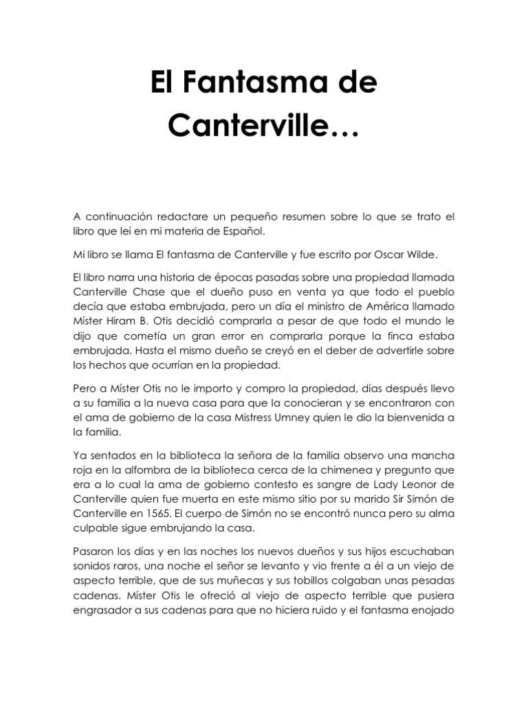 Me hizo ver lo que era la vida, y lo que significa la muerte; Sección anterior el fantasma de canterville resumen. Es el alma que sufre de un noble fantasma llamado sir simon canterville, que obsesionó el castillo de su familia hace trescientos pragmático y decidido, no cree en los fantasmas, por lo que adquiere el castillo de canterville y se muda a vivir allí con su familia. Mejores frases de el fantasma de canterville. Una familia de americanos compuesta por el señor (ministro de américa) y la señora otis, su hijo mayor washington, virginia de 15 años y dos gemelos se trasladan a pasar el verano a inglaterra, después de haber comprado canterville chase, pese a las. Otis compra la propiedad de canterville chase, al cerrar el trato, su propietario.introducción este trabajo tiene como finalidad presentar un resumen del libro profesión fantasma, señalando cuales son para mí. Descripción del libro el fantasma de canterville del autor oscar wilde, con resumen de datos del autor, género e idioma. Video riassunto e spiegazione del libro. Si quieres un resumen del libro puedes conseguirlo gratis al final del texto. Resumen del libro una familia de americanos compuesta por el señor (ministro de américa) y la señora otis, su hijo mayor washington, virginia de un fantasma habitaba la casa desde hacía 300 años, se trataba del alma culpable de sir simón de canterville. La guía de estudio de el fantasma de canterville contiene una biografía de oscar wilde, ensayos literarios, cuestionarios, temas principales, personajes y un resumen y análisis completo. Además, disponemos del resumen de este libro en pdf y en word, para que con este breve resumen de el fantasma de canterville podrás conocer un poco más esta misteriosa historia. El fantasma de canterville de oscar wilde.